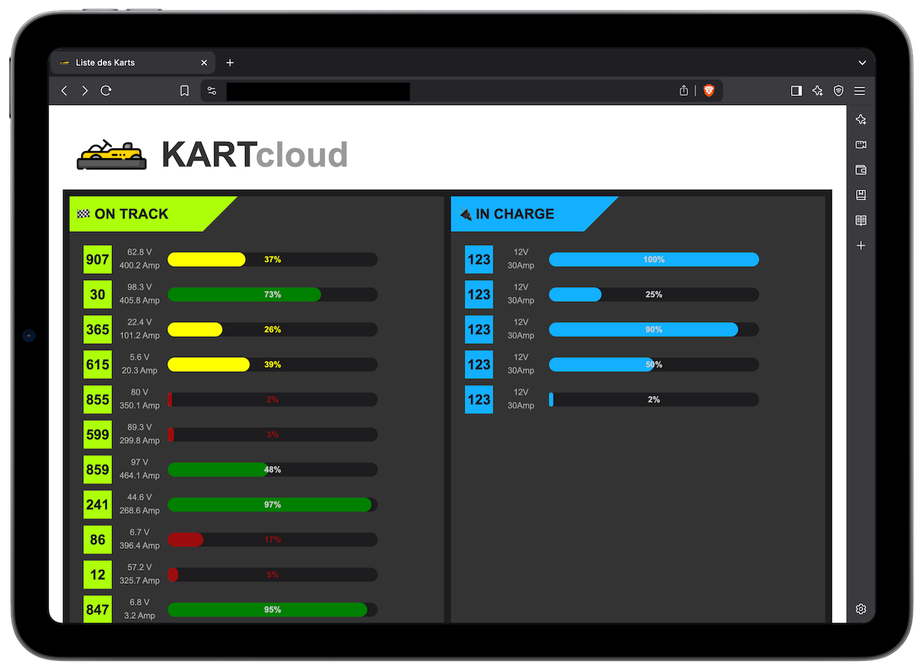 Utiliser le wifi local pour connecter les karts et remonter les données dans le cloud pour consulter chaque kart dans une page web, depuis un ordinateur ou une tablette.
